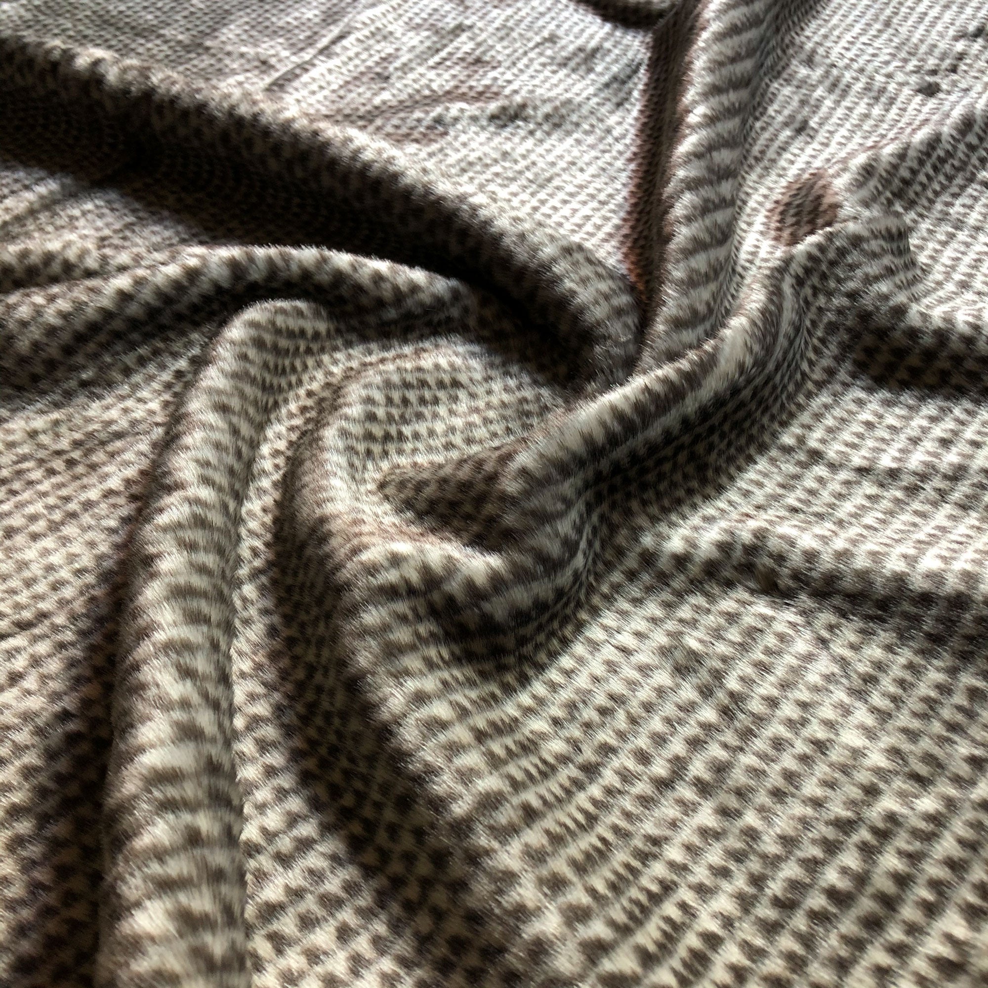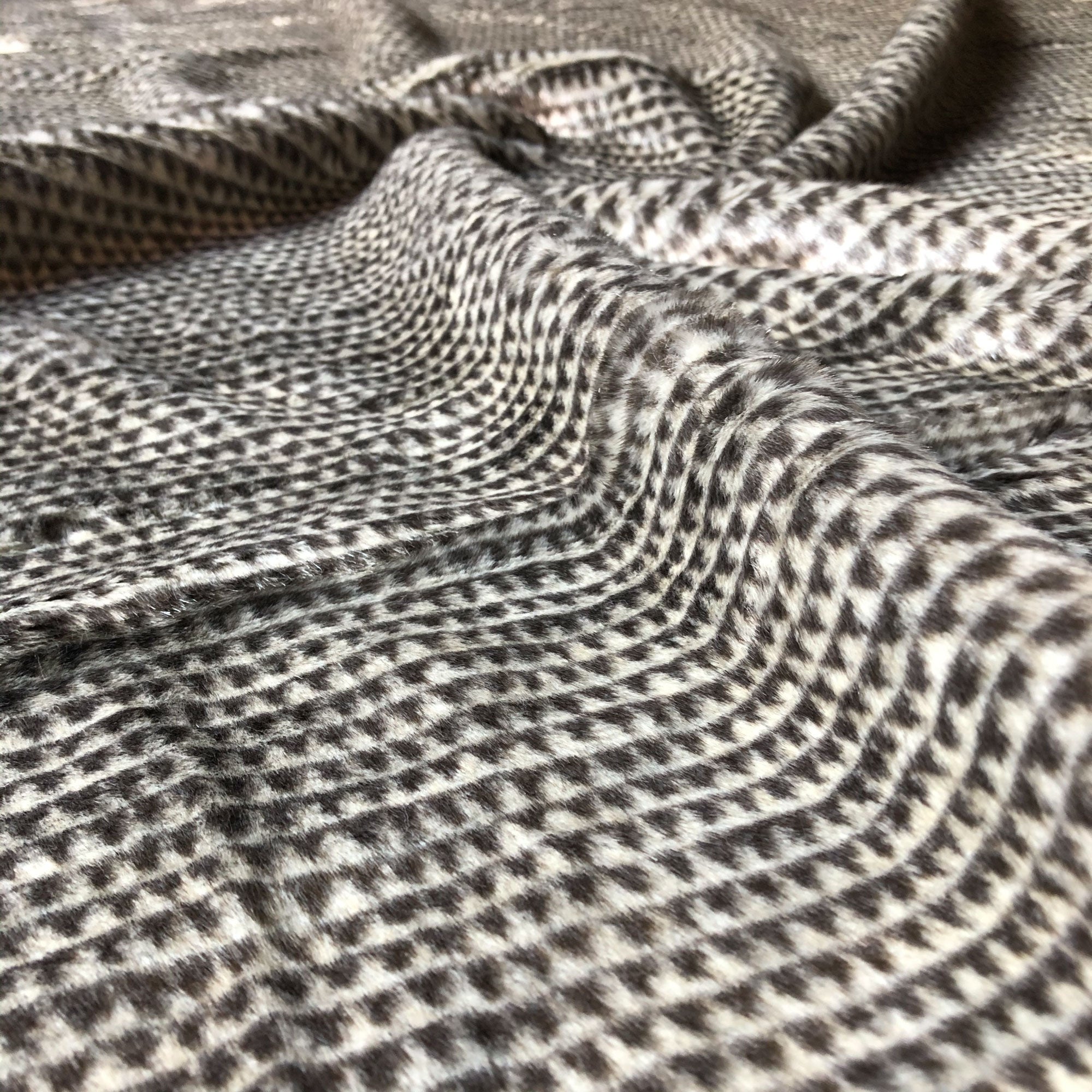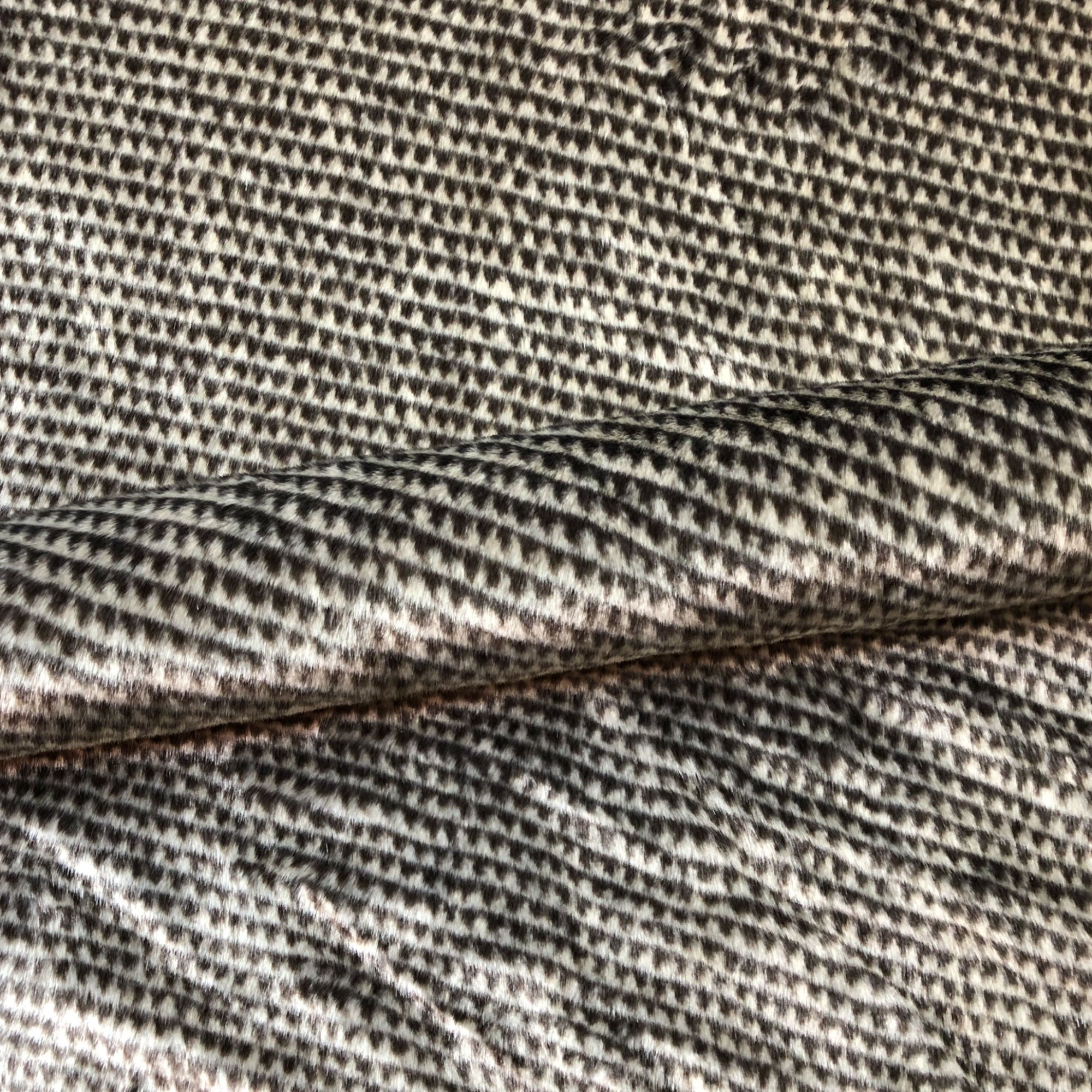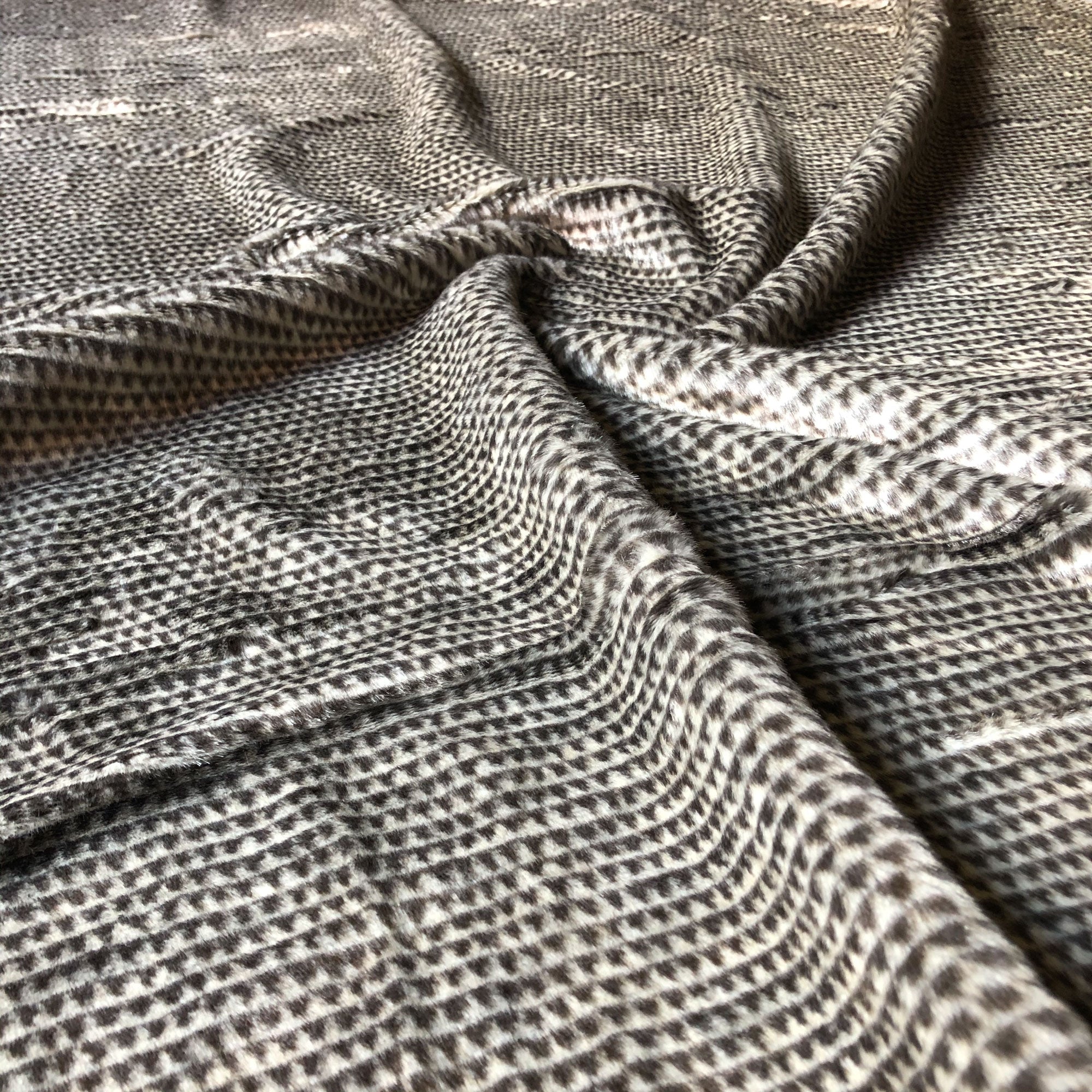 Enliven any interior with this Dark Brown/Beige Luxe Geometric Faux Fur Upholstery Fabric 54", perfect for all your upholstery needs. Give your bedding, chairs, cushions, windows and more a fresh new look with our selection of high quality fabrics curated by a team of forward thinking designers. Having limitless uses, this luxurious dark gray faux fur upholstery fabric meets flair with versatility, offering the perfect personal touch for any Luxe Boho aesthetic. Designed to last, this fabric can provide the perfect look for your home. All fabric is sold by the yard in 1-yard increments. Unfortunately, we do not accept returns on fabric orders but samples are available by purchasing a $3 swatch.