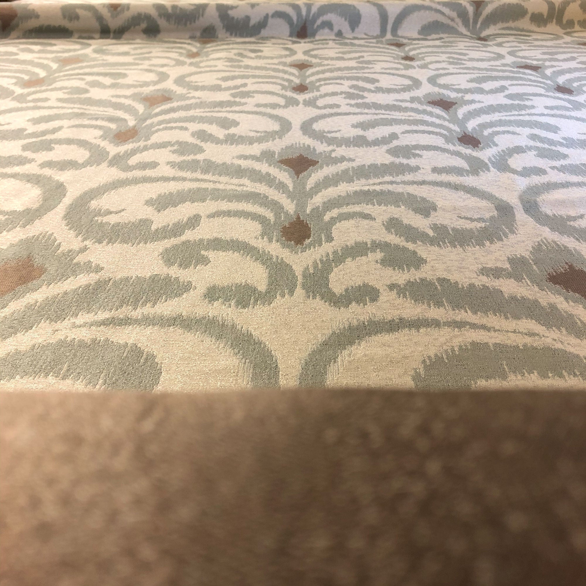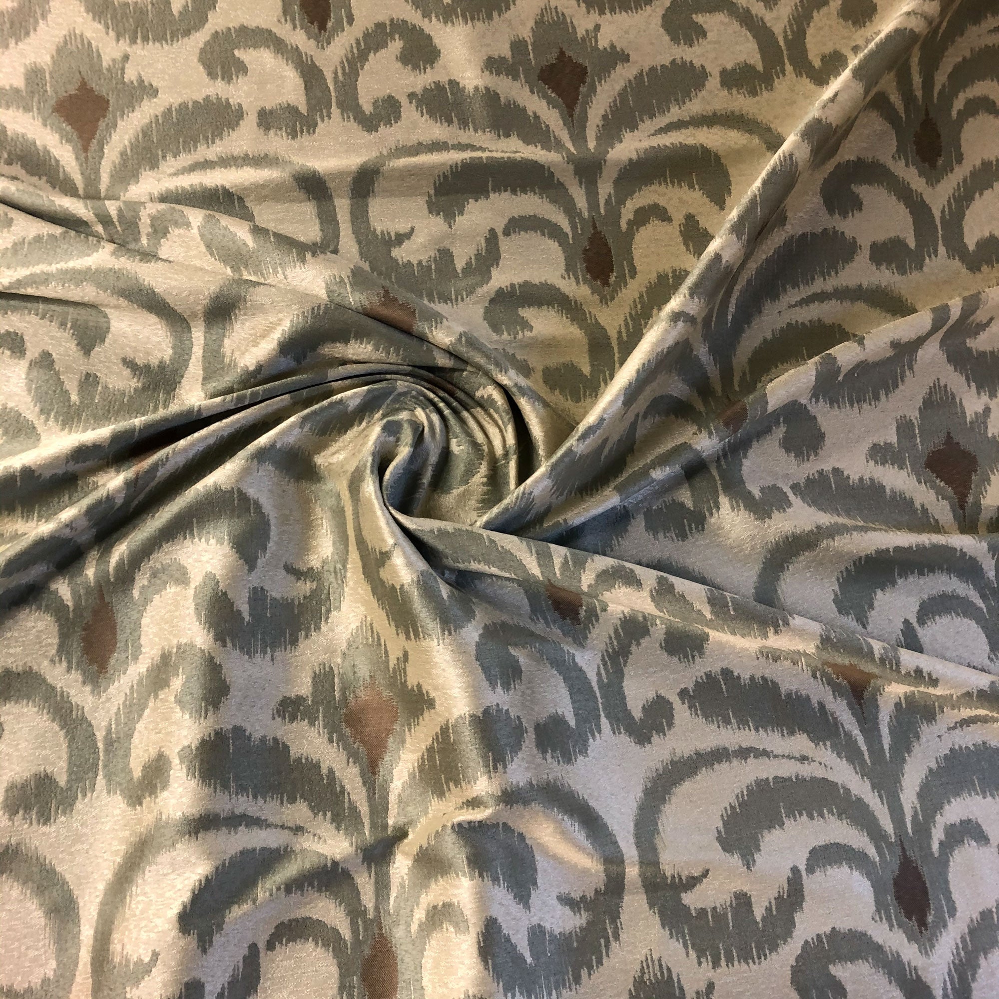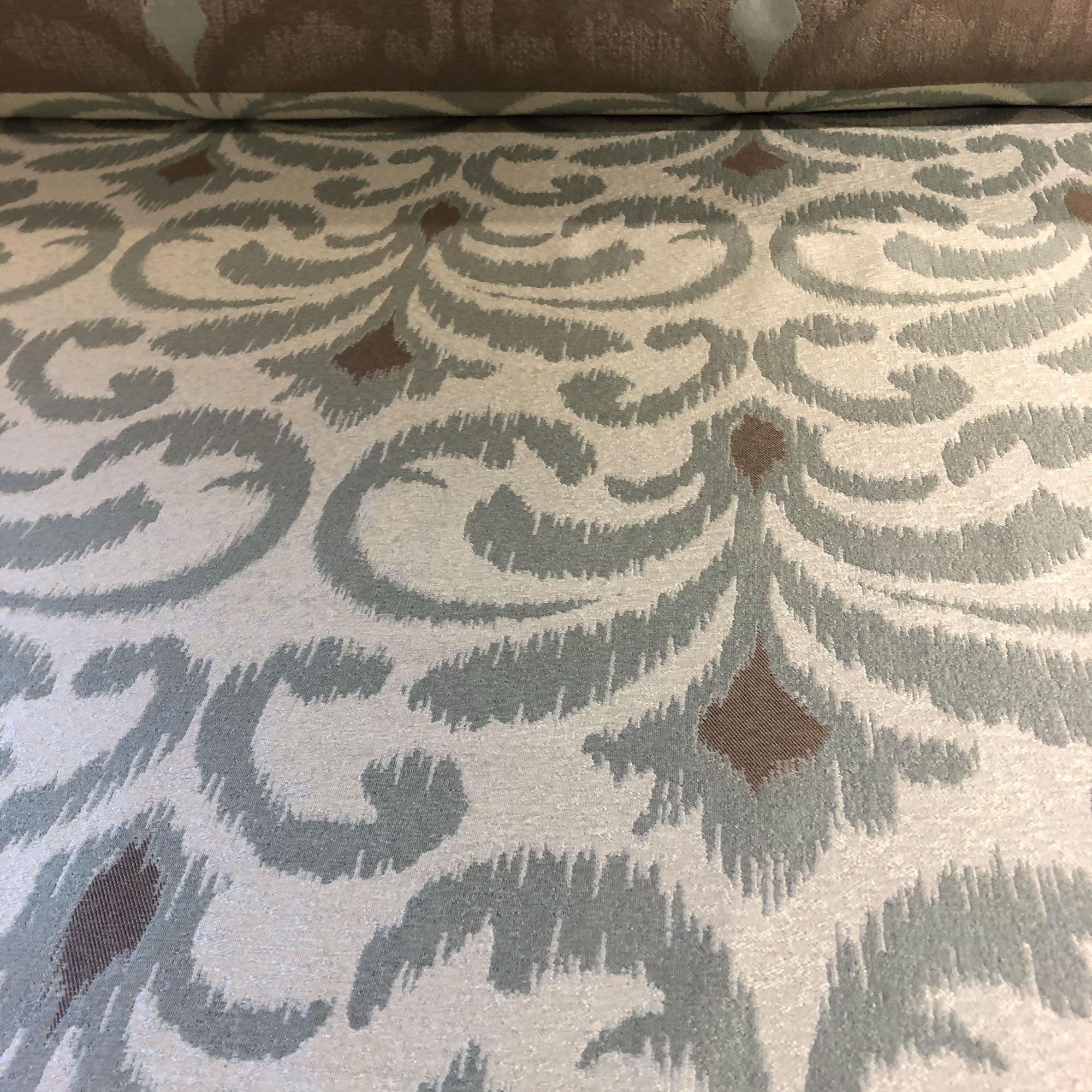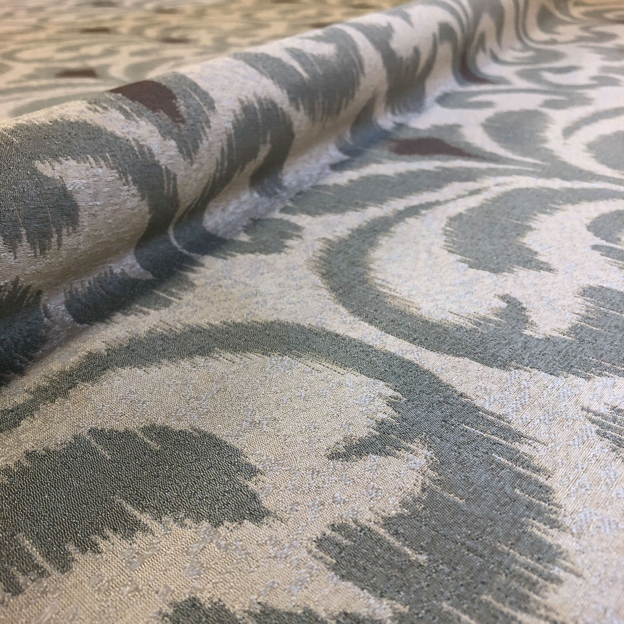 This luxurious scroll pattern jacquard upholstery fabric in silver meets flair with versatility, offering the perfect personal touch for any traditional aesthetic. Designed and crafted by skilled textile artisans this fabric is made to last and never compromises on quality. All fabric is sold by the yard in 1-yard increments. Unfortunately, we do not accept returns on fabric orders but swatches are available.