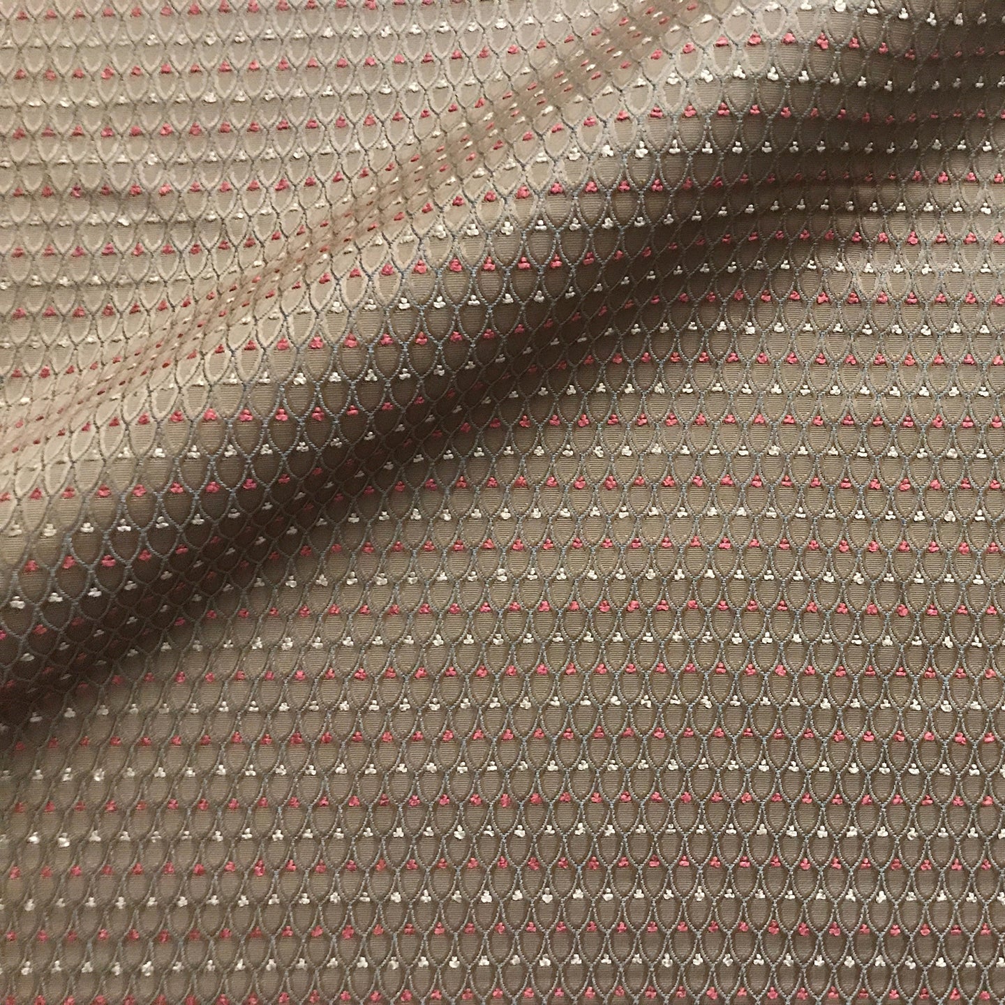 Chocolate brown fabric with an intricate ivory geometric pattern with burgundy and ivory dobby dot pattern within.