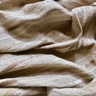Fabulously textured stripe woven into the slightly ruched fabric in neutral tones accentuate the soft linear textures.Tufted and velvet stripes contrast the neutral base while gold embroidery softens the look.