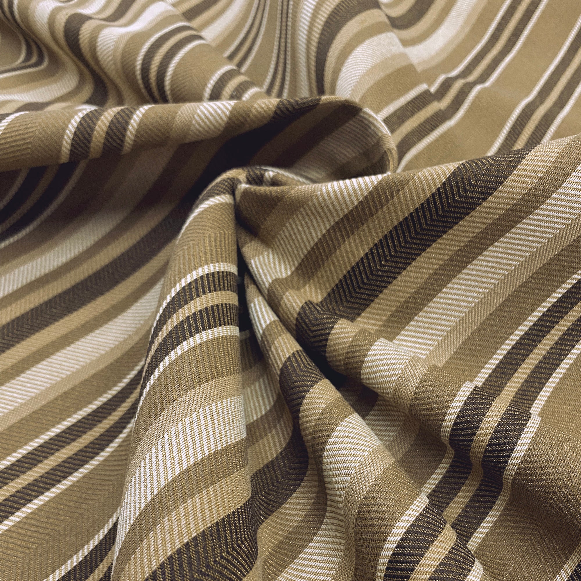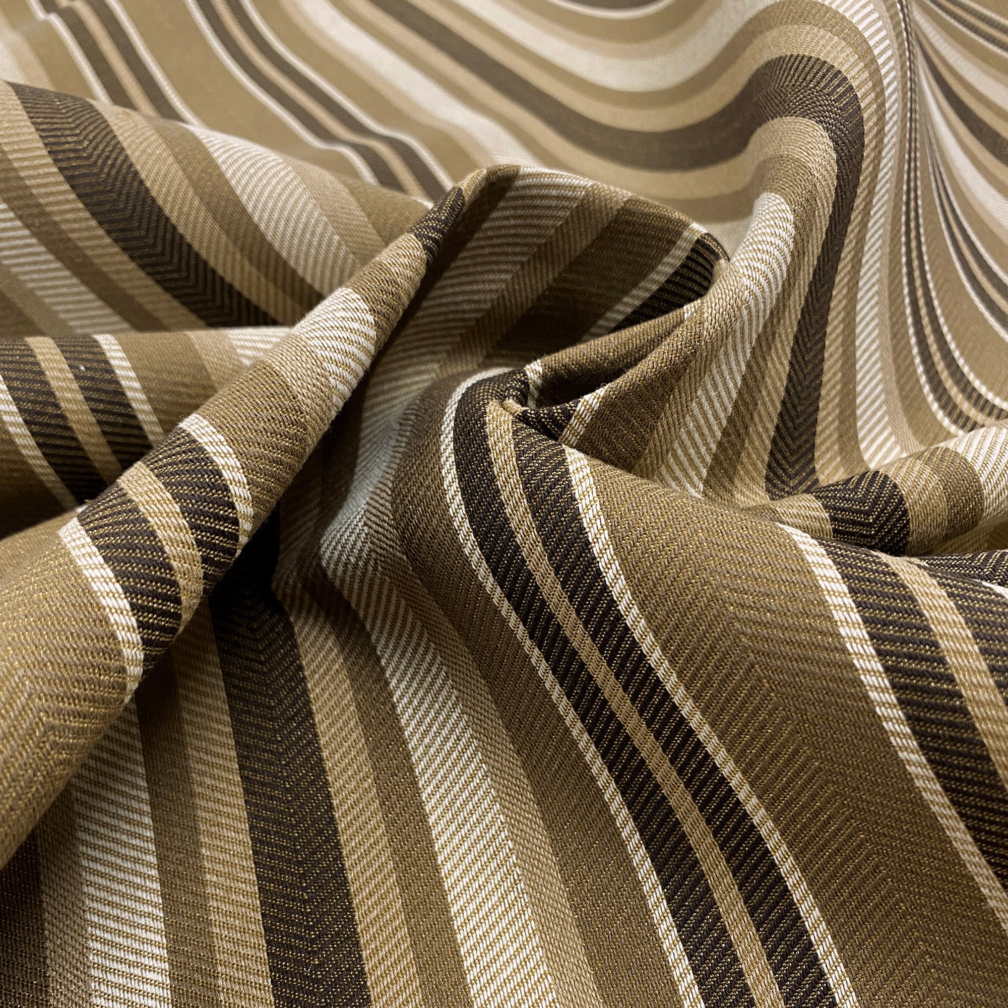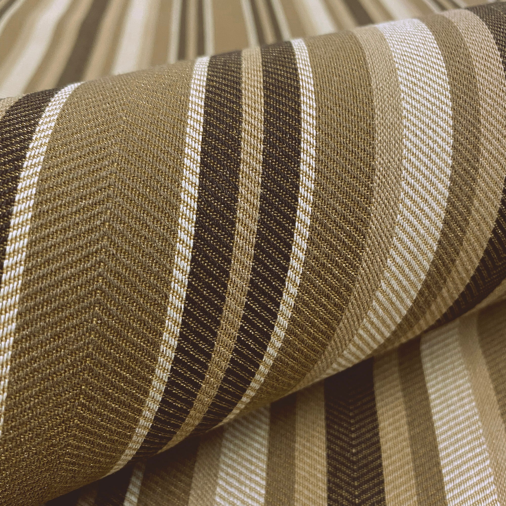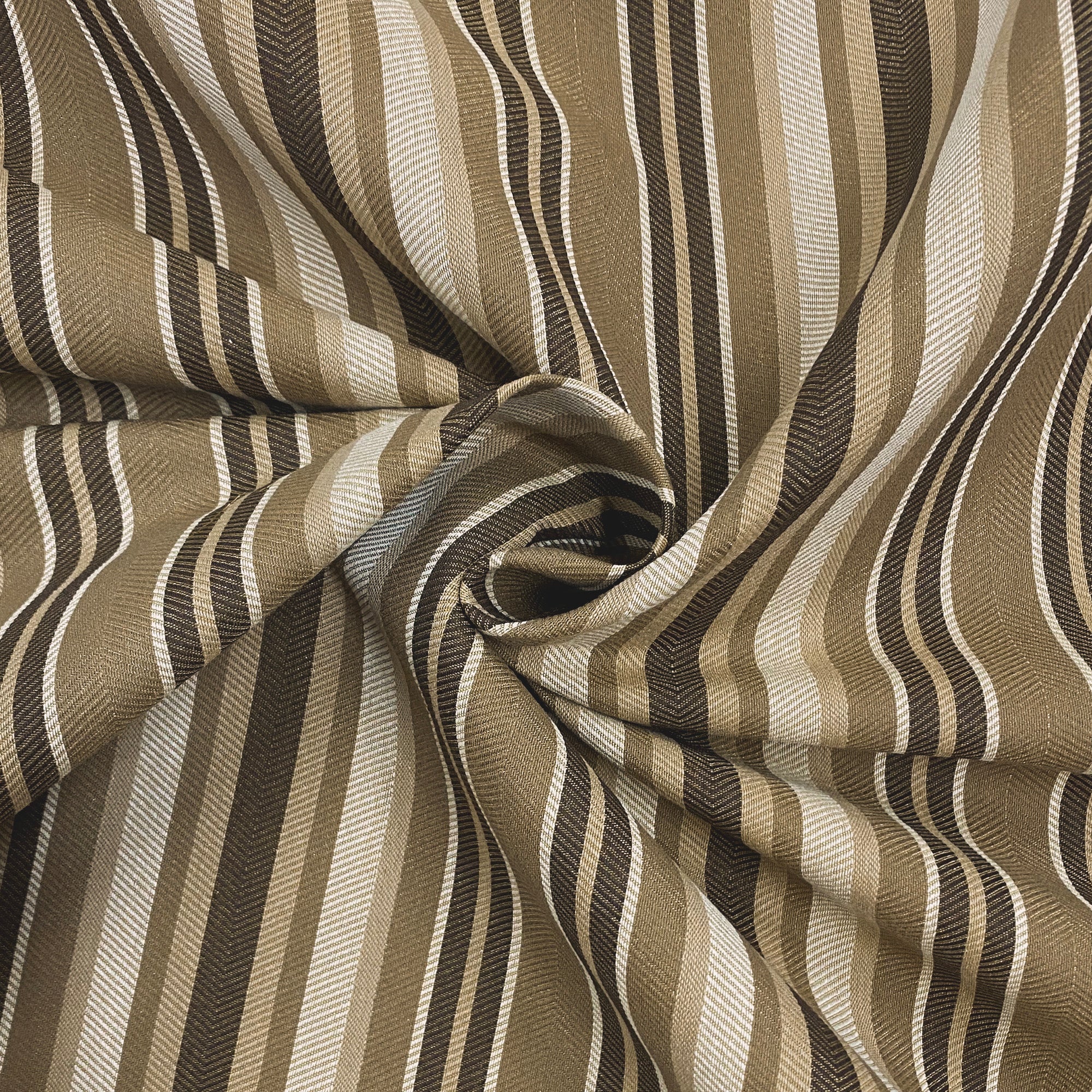 This luxurious striped upholstery fabric in brown hues meets flair with versatility, offering the perfect personal touch for any traditional aesthetic. Designed and crafted by skilled textile artisans this fabric is made to last and never compromises on quality. All fabric is sold by the yard in 1-yard increments. Unfortunately, we do not accept returns on fabric orders but swatches are available.