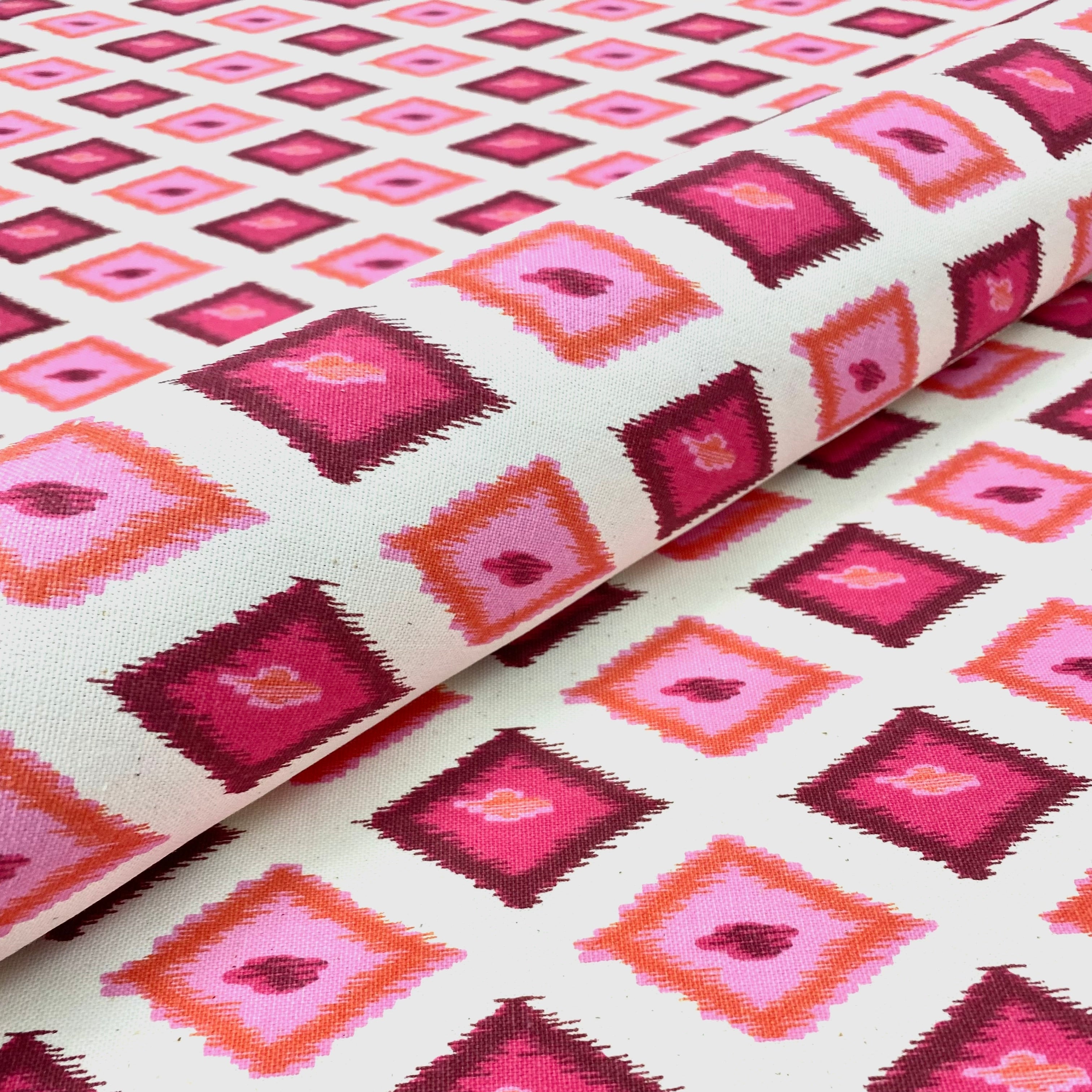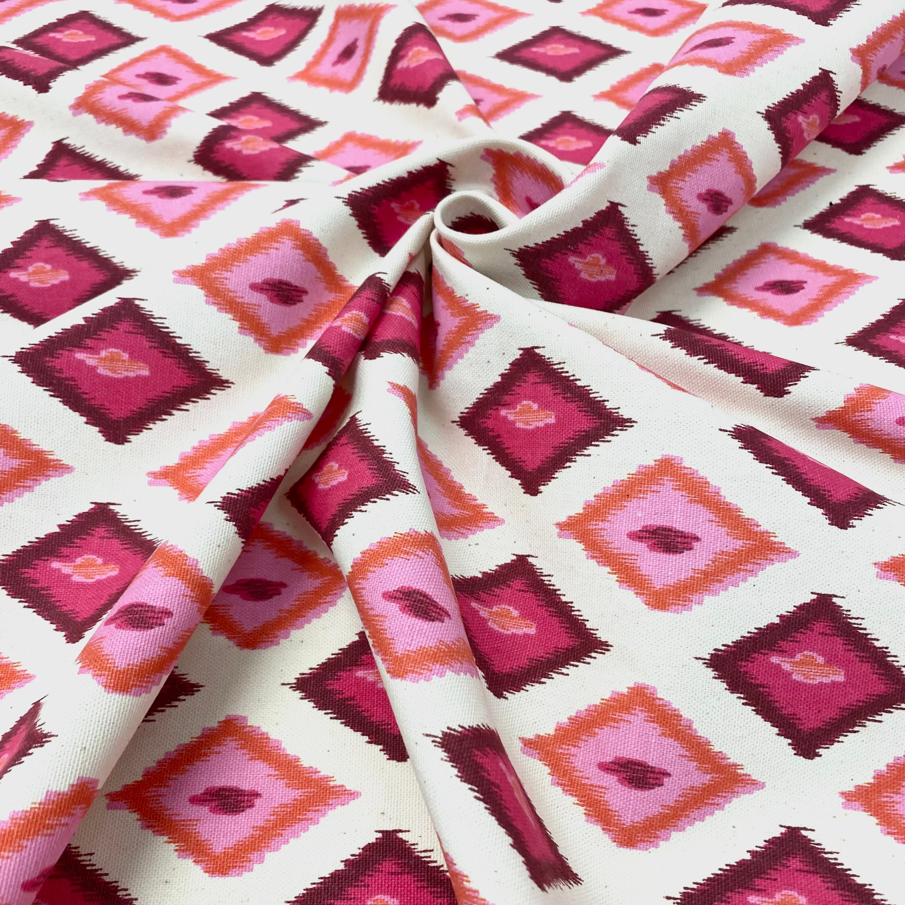 This luxurious Carnival Pink Diamond Southwestern Geometric Cotton Fabric 54 meets flair with versatility, offering the perfect personal touch for any Southwestern aesthetic. Designed and crafted by skilled textile artisans this fabric is made to last and never compromises on quality. All fabric is sold by the yard in 1-yard increments. Unfortunately, we do not accept returns on fabric orders but swatches are available.