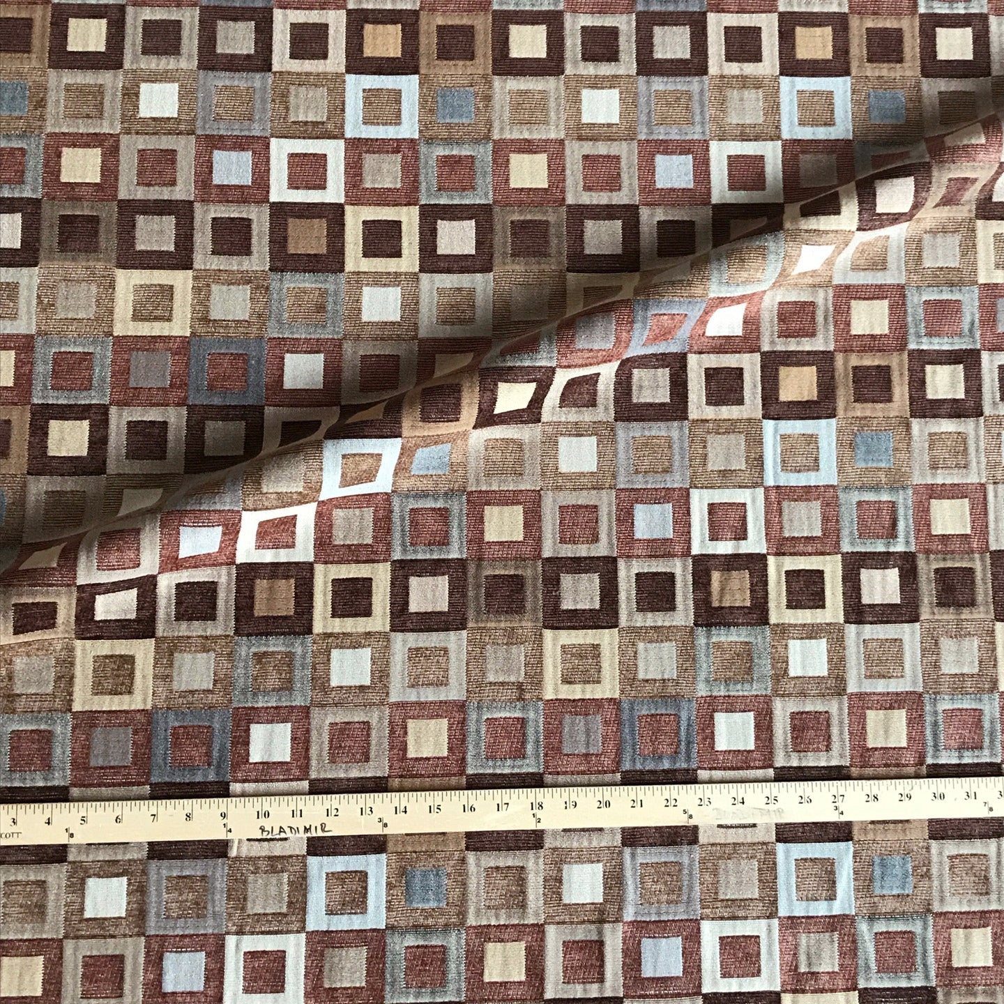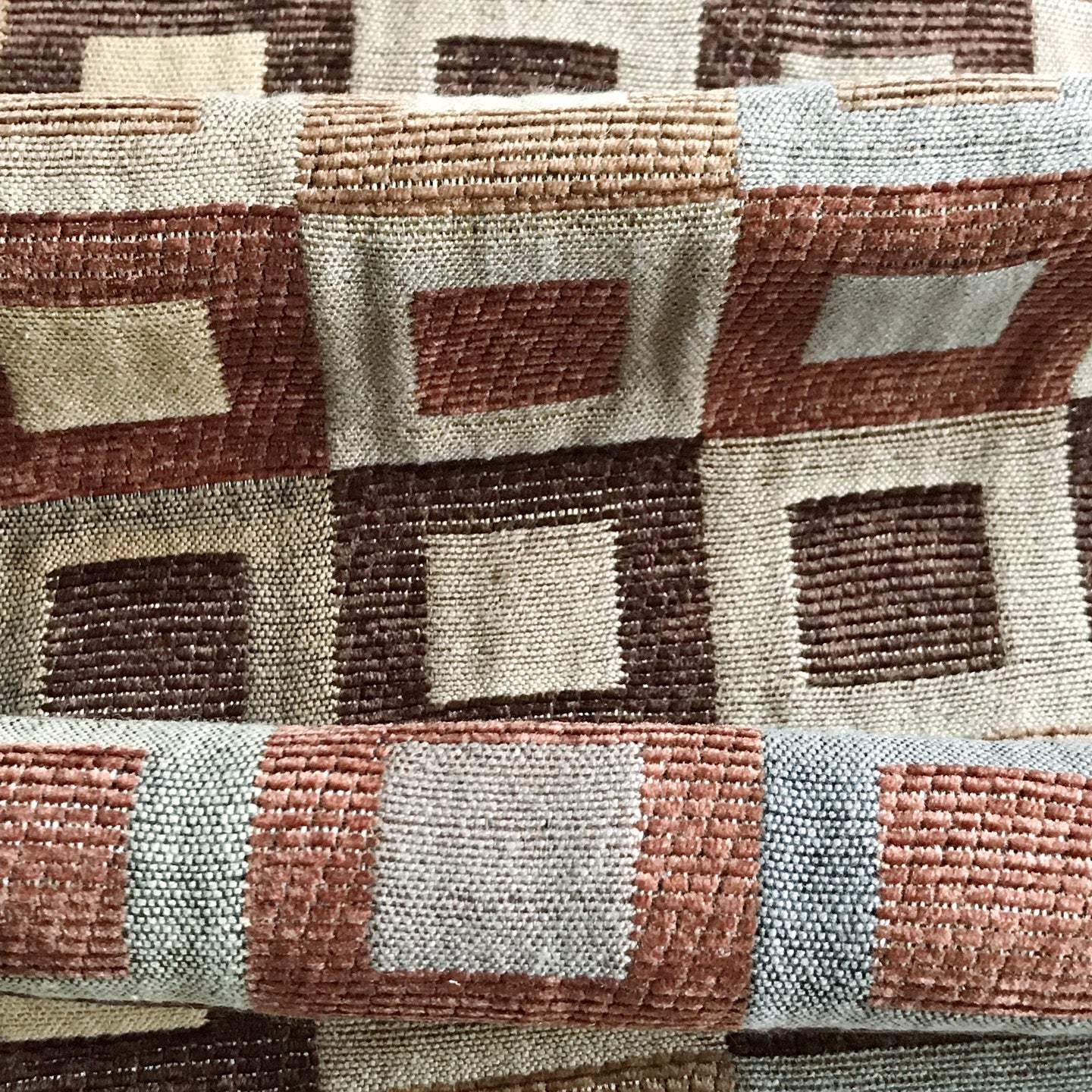 Fall hued coloring within a cotton, velvet blended fabric with a check box pattern.