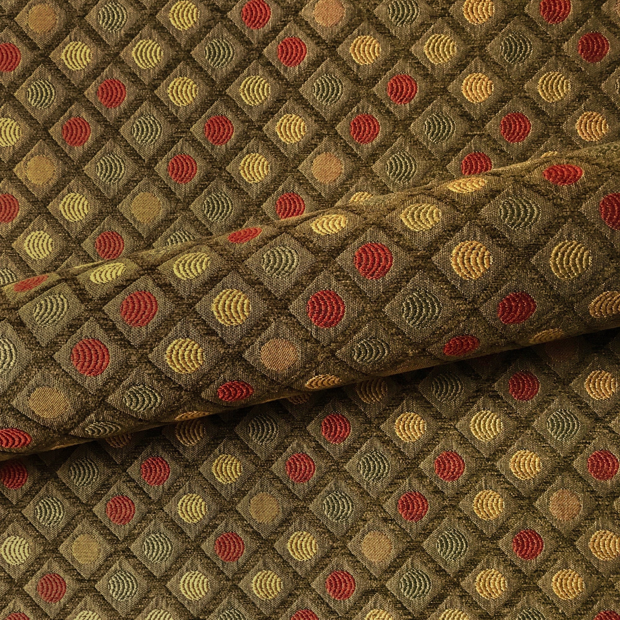 Adorn any interior with this Olive Brown Mid Century Geometric Polka Dot Upholstery Fabric 54", perfect for arts and crafts, DIY, upholstery, home decorating, and more. Give your bedding, chairs, cushions, windows and more a fresh new look with our selection of high quality fabrics curated by a team of trend leading designers. This luxurious geometric upholstery fabric in brown meets flair with versatility, offering the perfect personal touch for any Mid Century aesthetic. Designed and crafted by skilled textile artisans this fabric is made to last and never compromises on quality. All fabric is sold by the yard in 1-yard increments. Unfortunately, we do not accept returns on fabric orders but swatches are available.