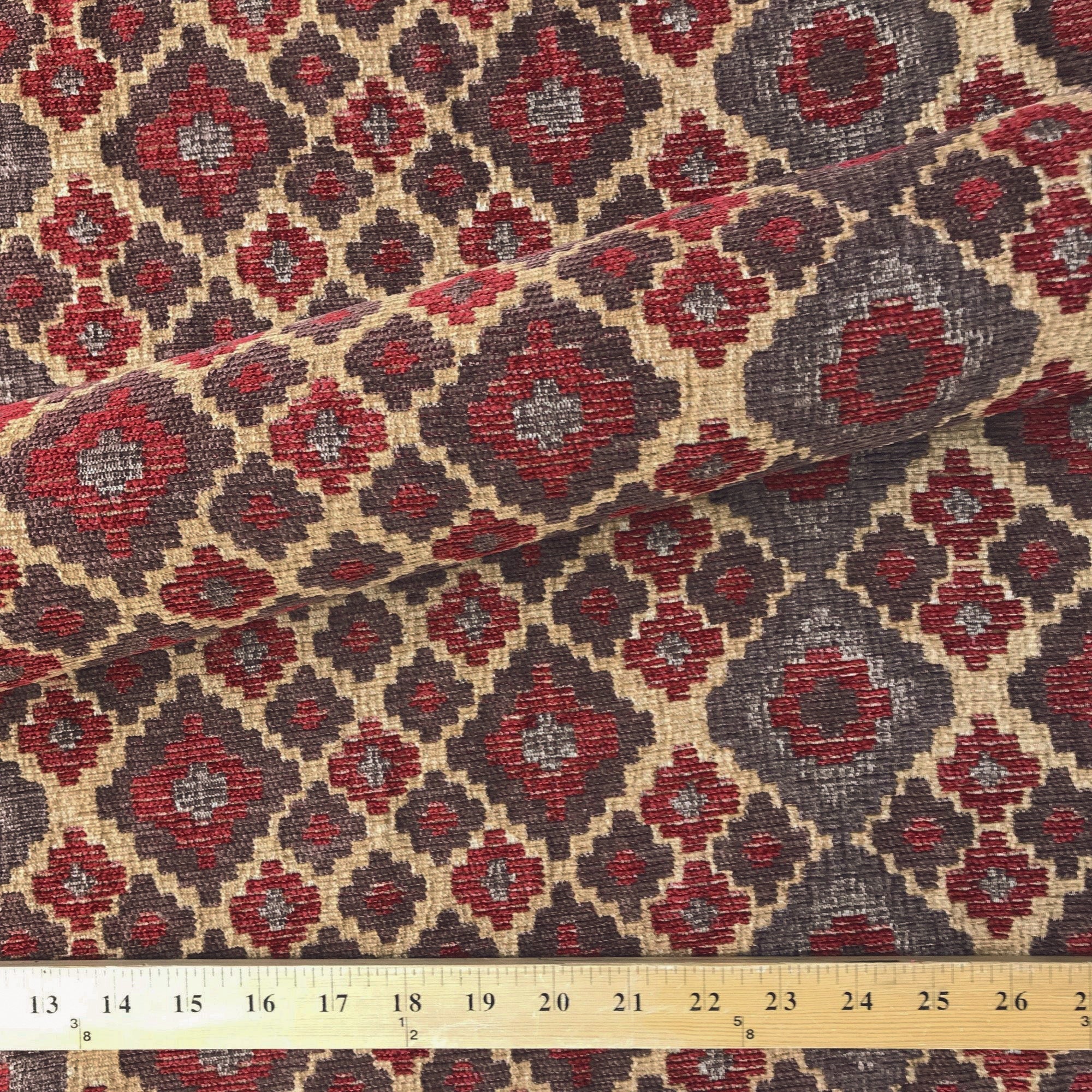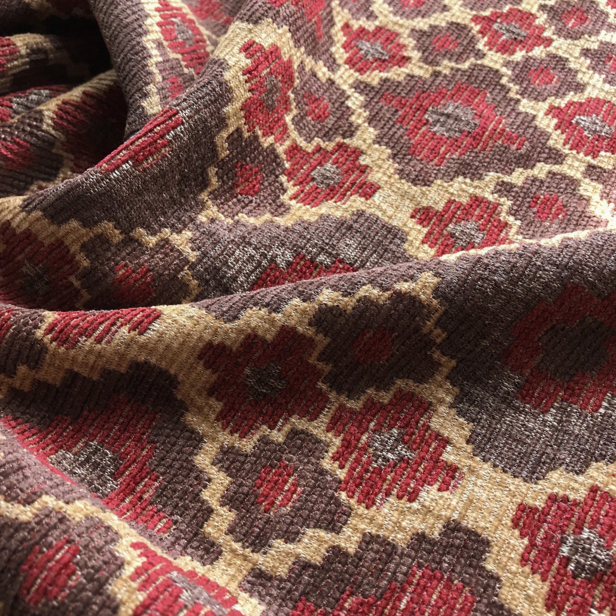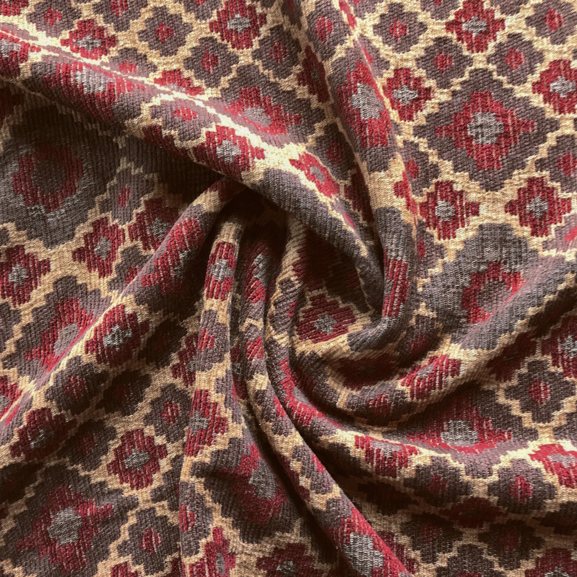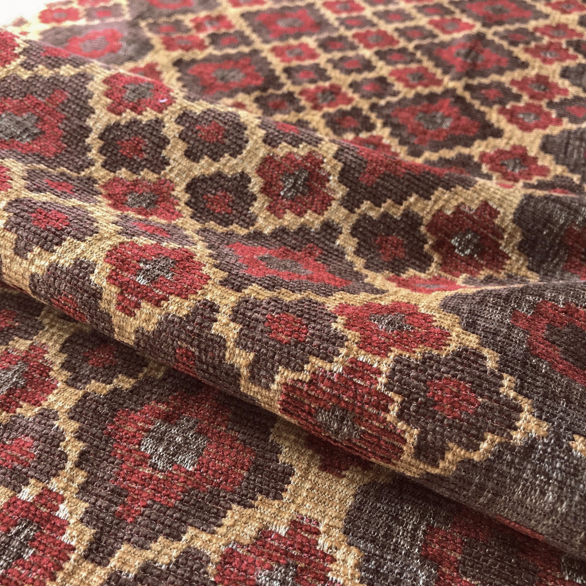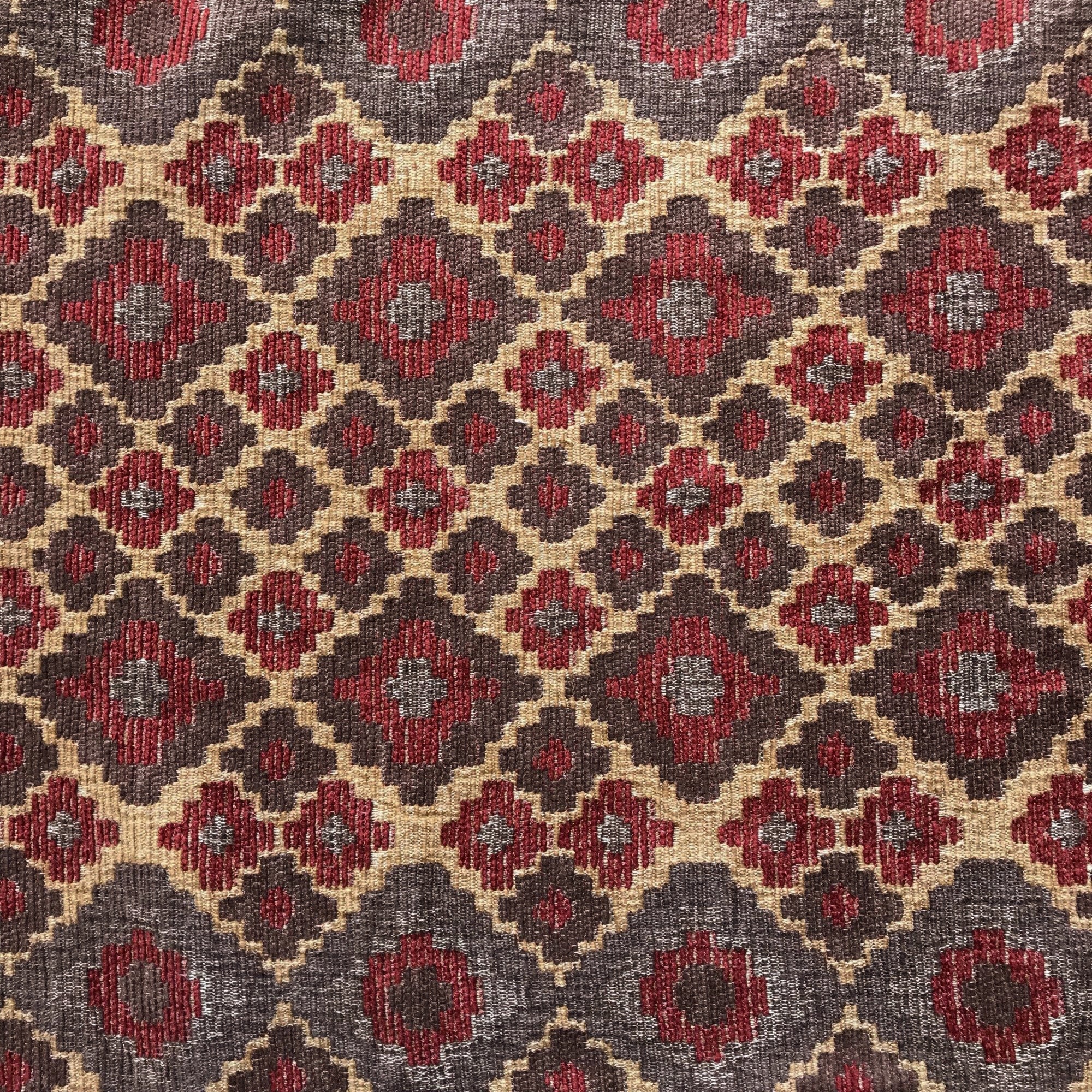 Geometric floral patterned upholstery fabric in earth tones.