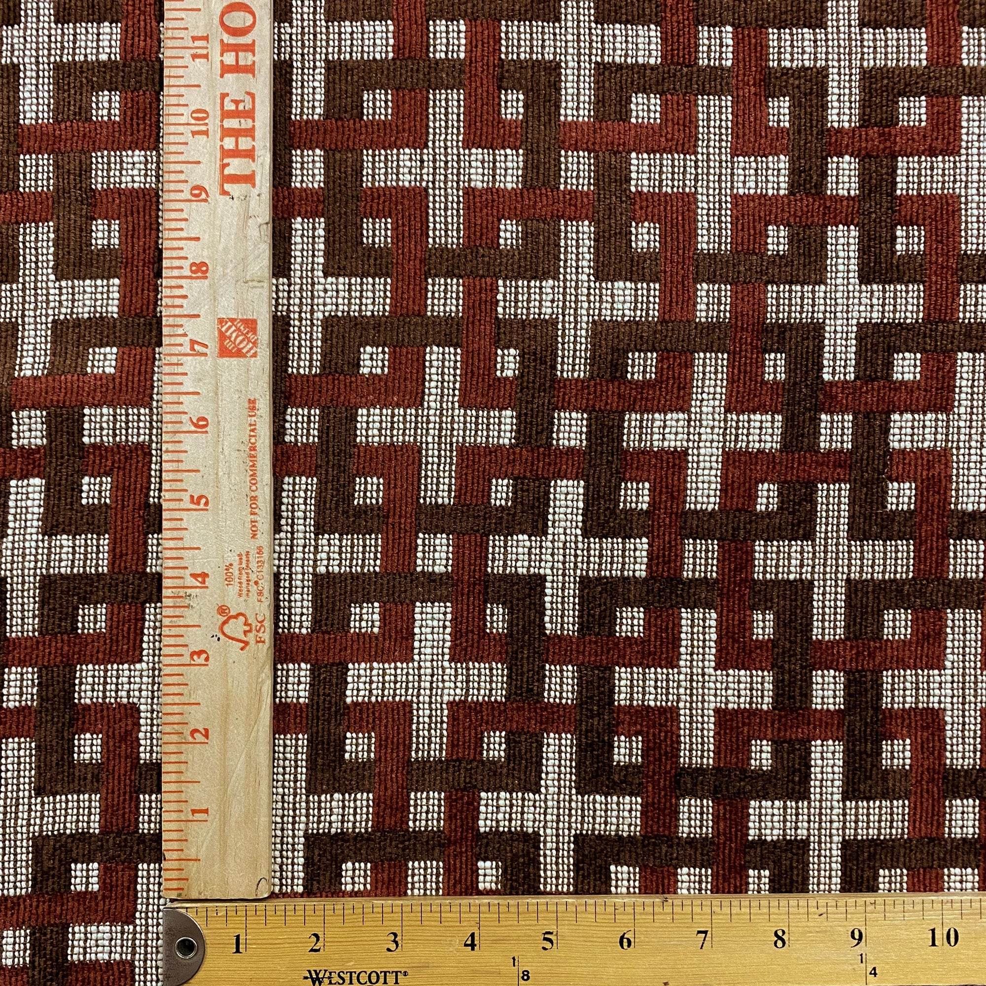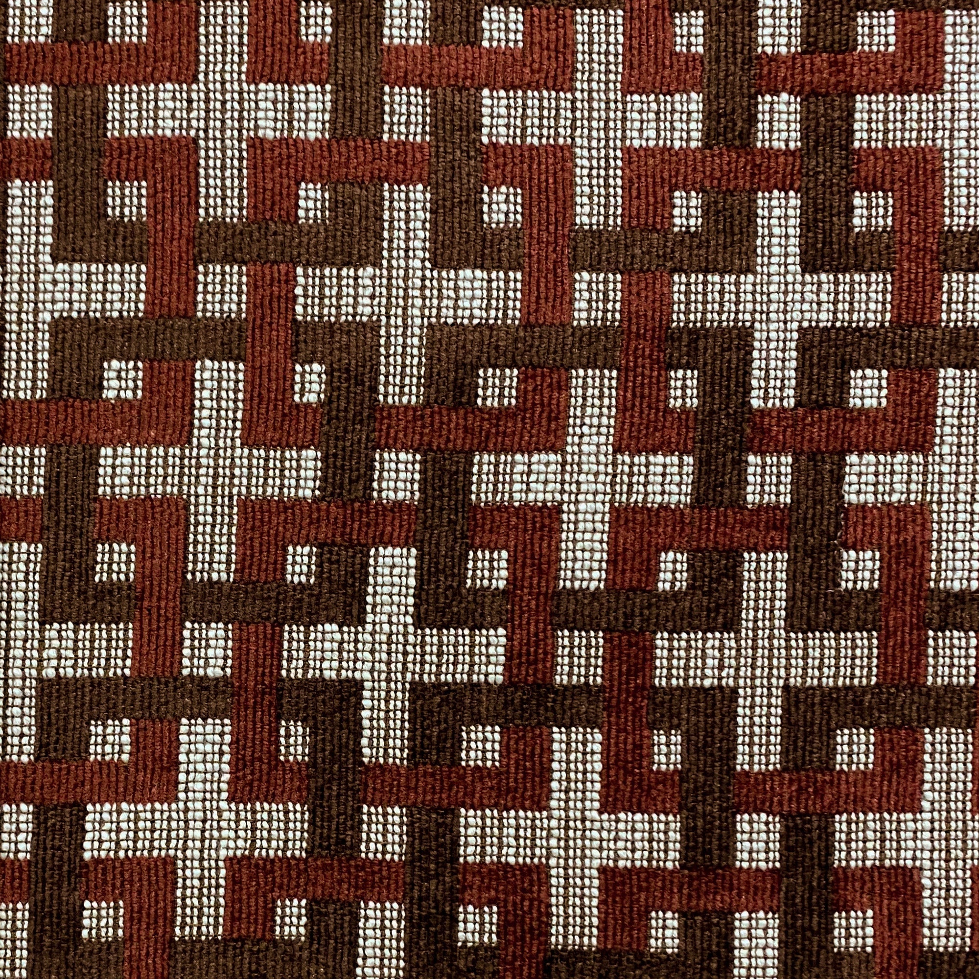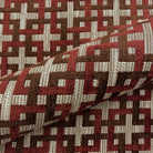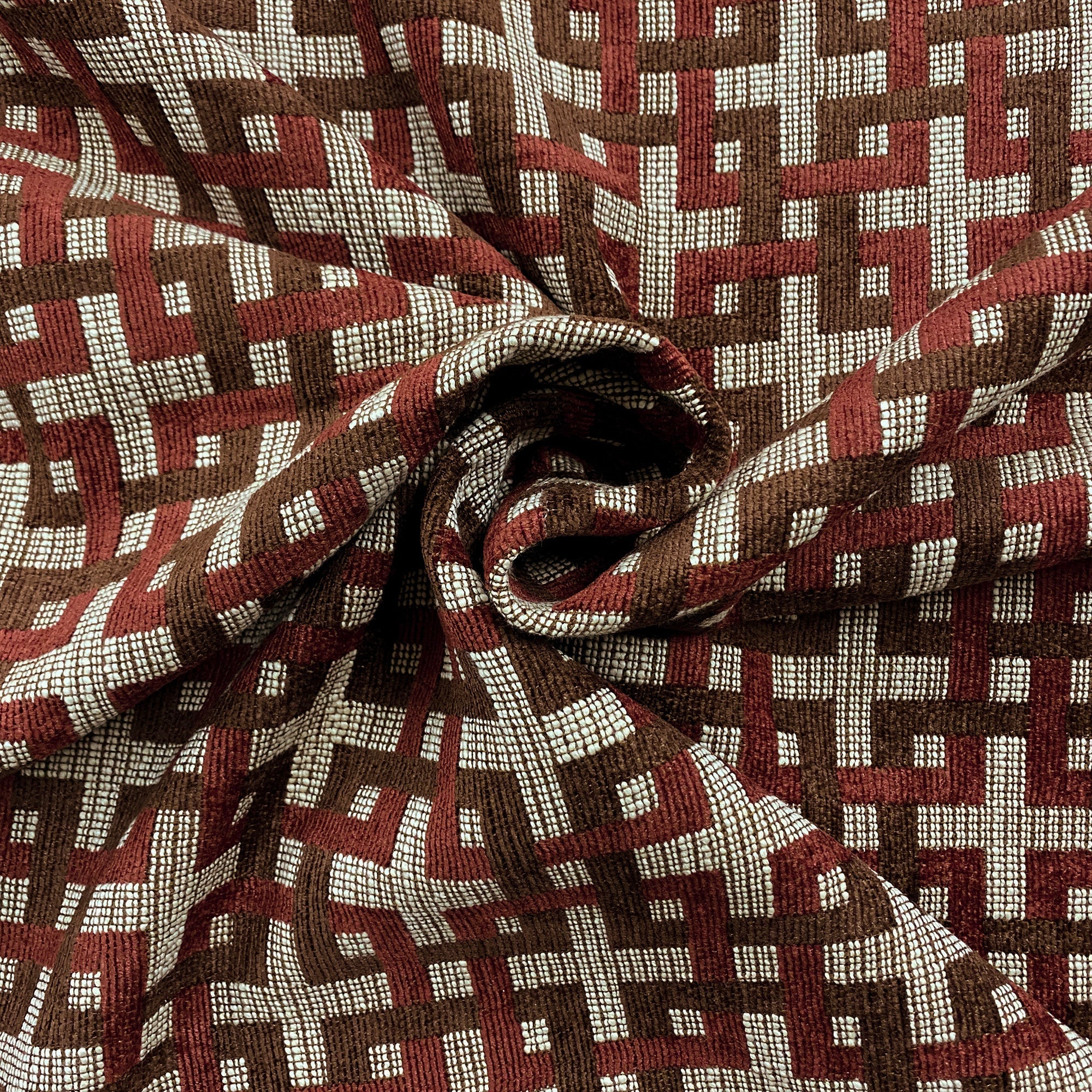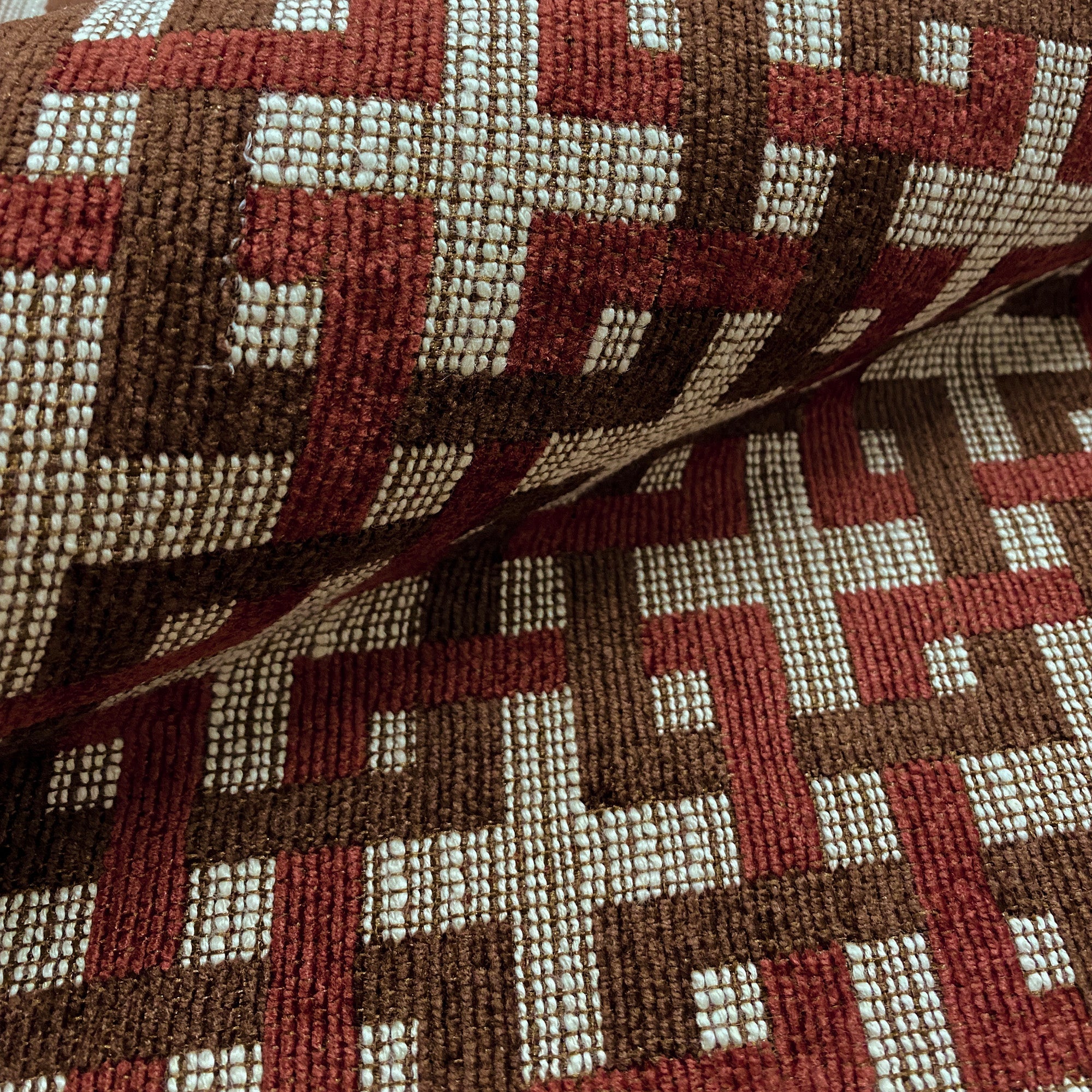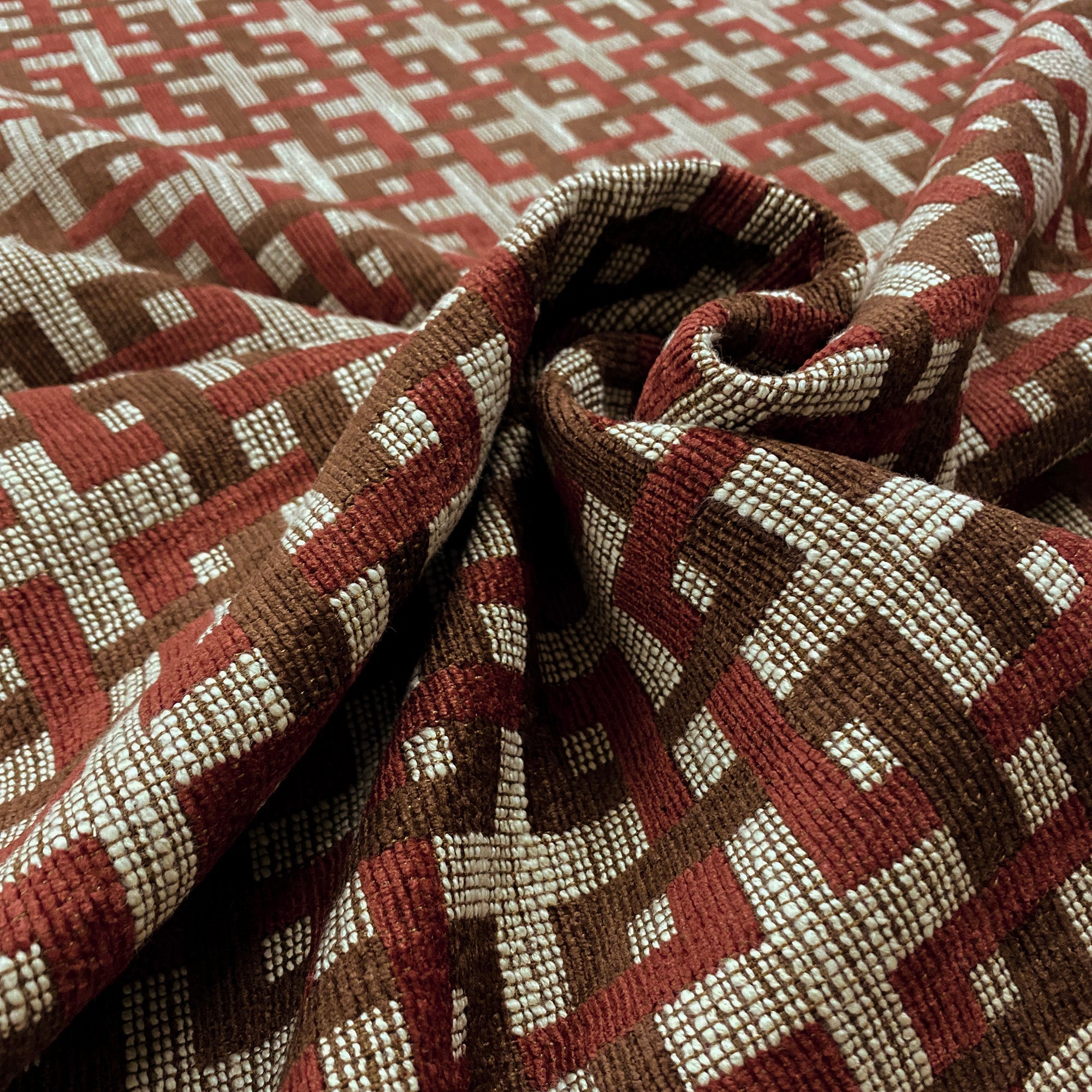 Chenille tapestry weave upholstery fabric with an abstract seamless pattern of intertwined squares in red and brown.