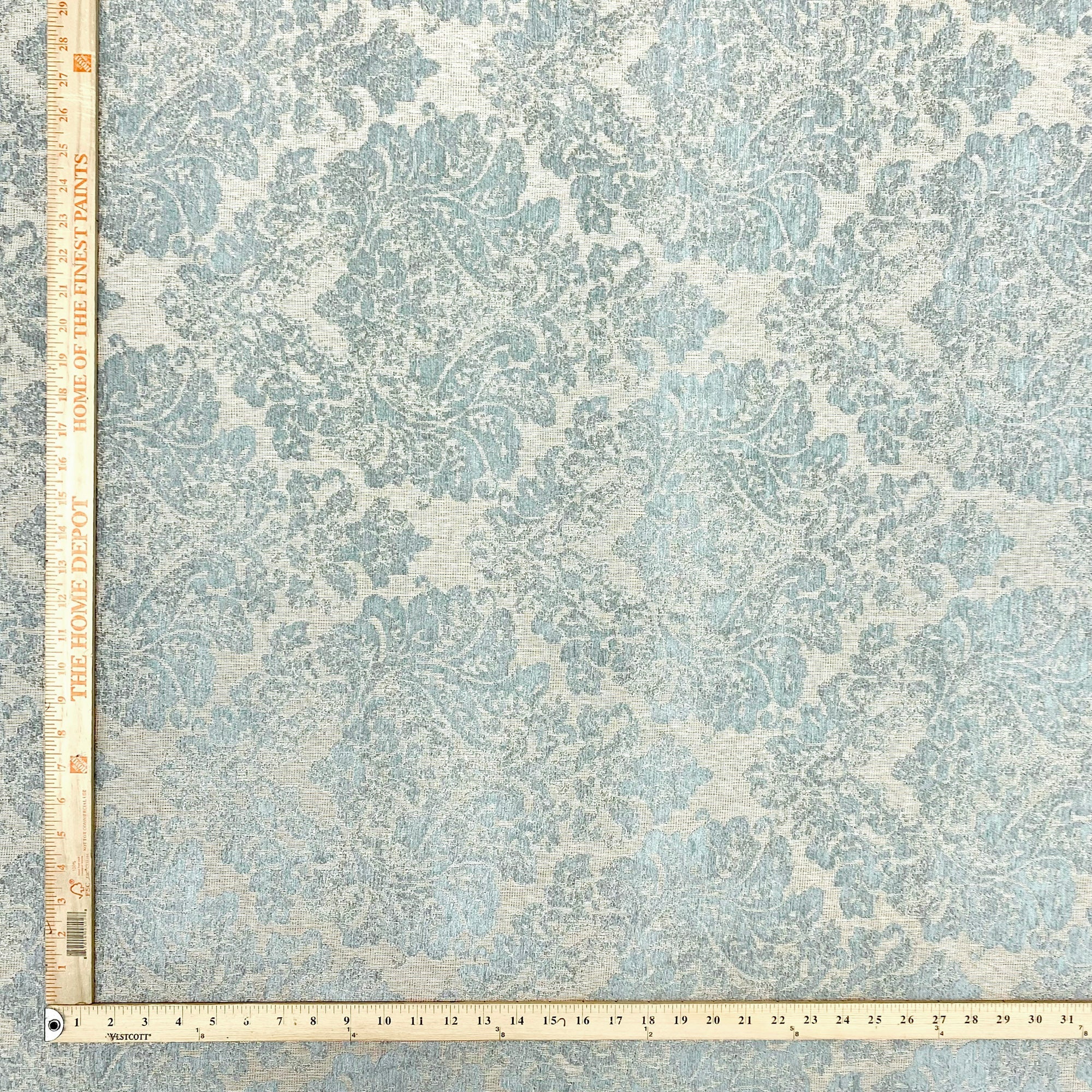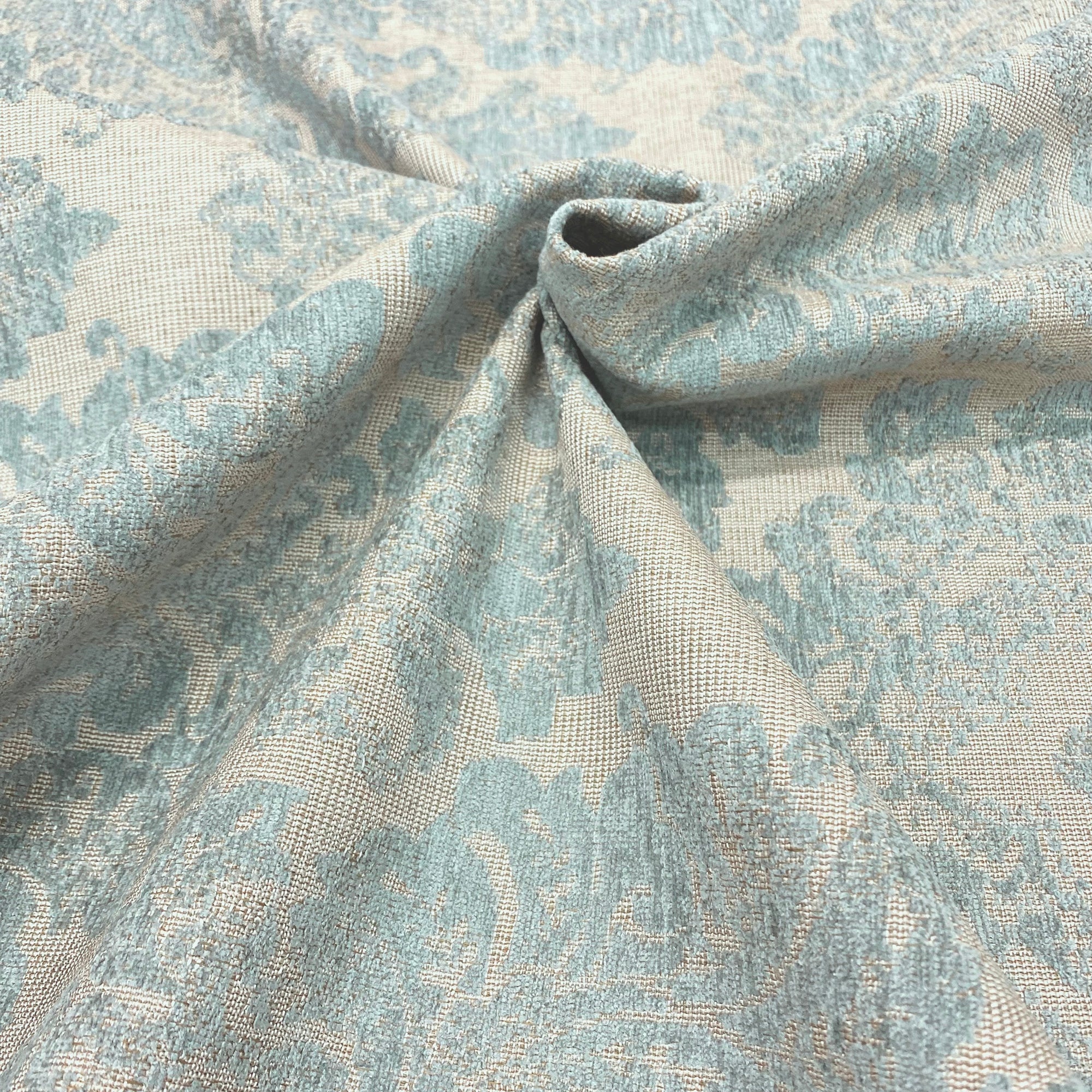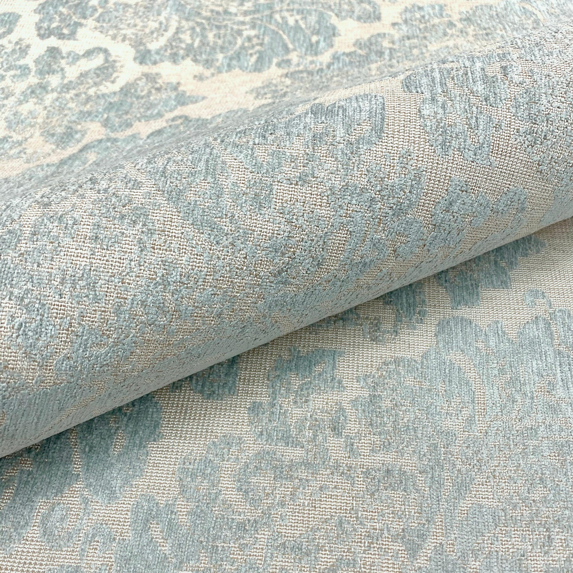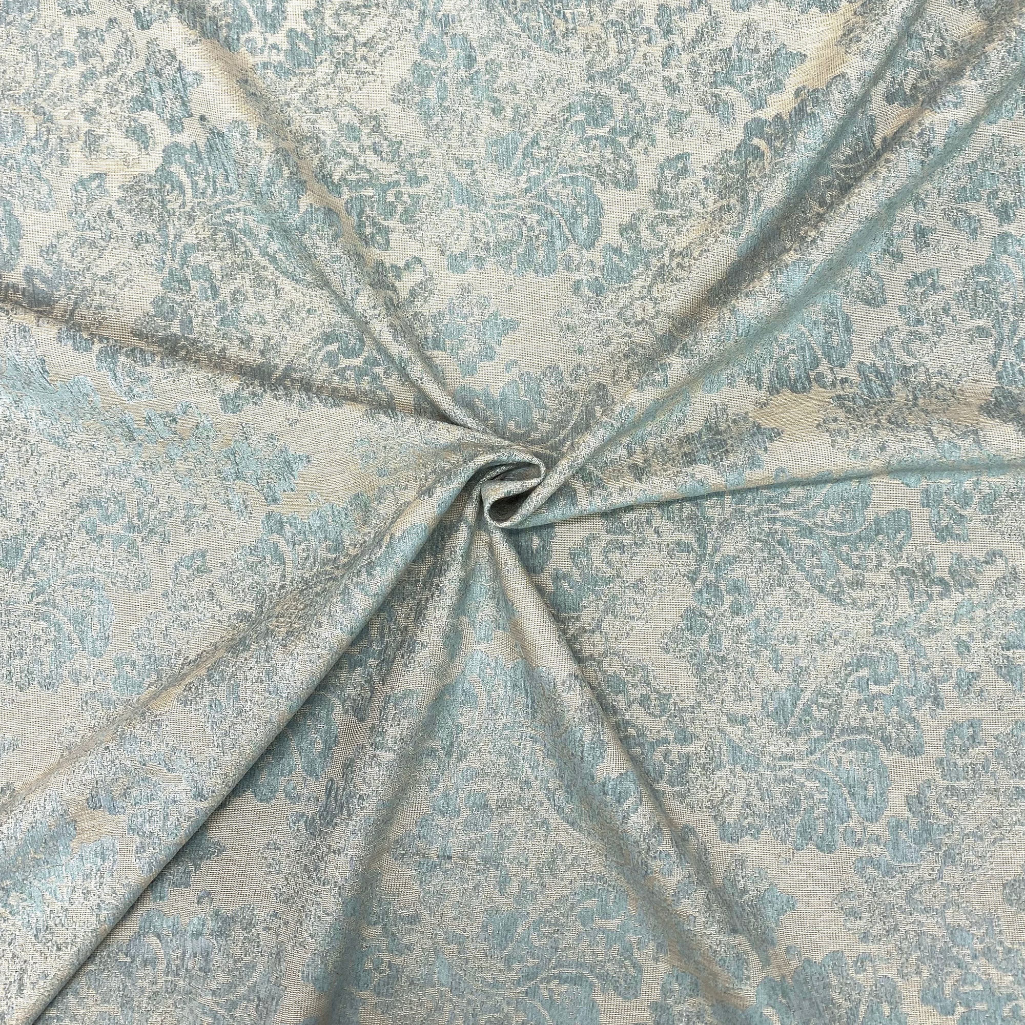 This luxurious jacquard upholstery fabric with sky blue damask in chenille meets flair with versatility, offering the perfect personal touch for any traditionally shabby chic aesthetic. Designed and crafted by skilled textile artisans this fabric is made to last and never compromises on quality. All fabric is sold by the yard in 1-yard increments. Unfortunately, we do not accept returns on fabric orders but swatches are available.