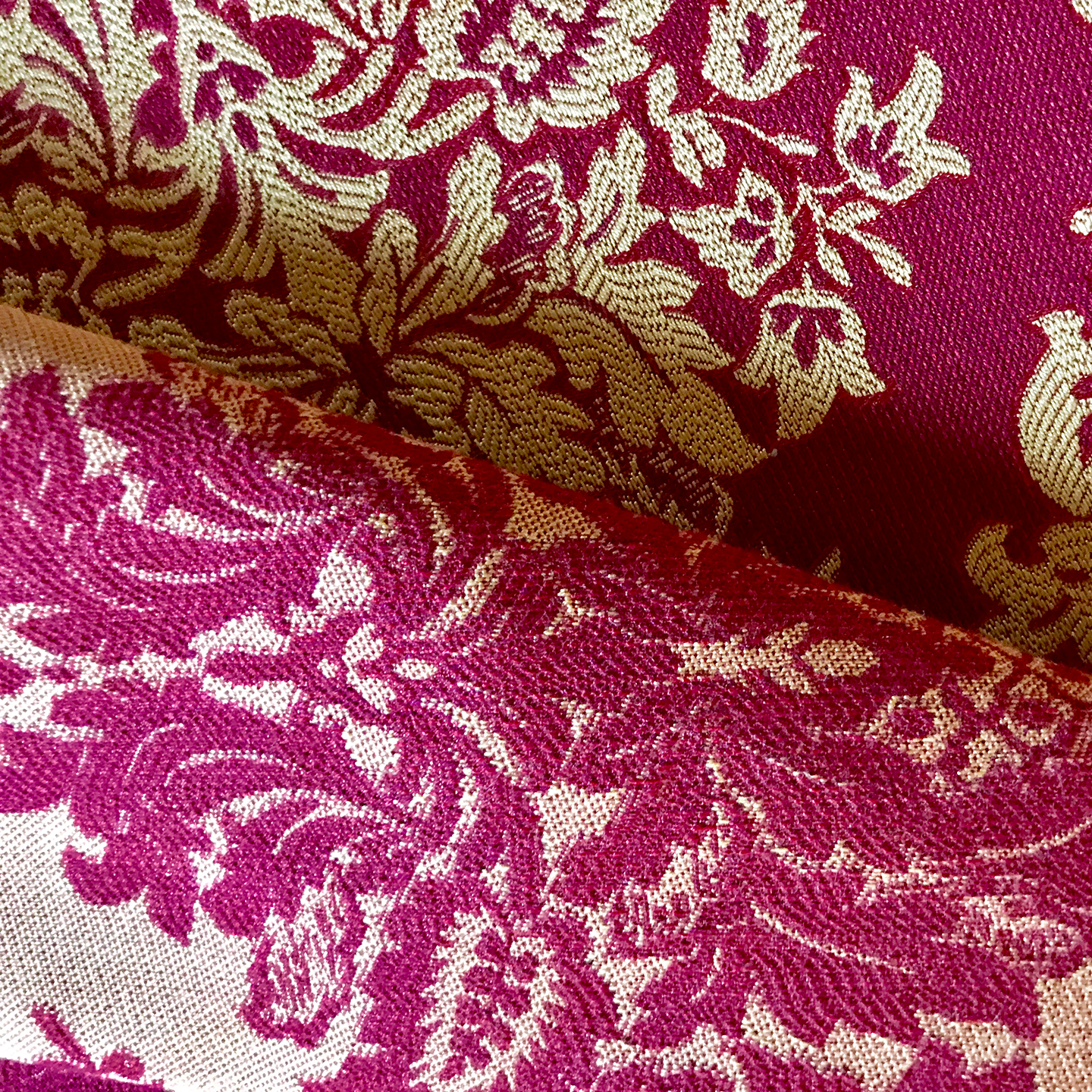 Coloring: Garnet red and gold damask fabric with geometric pattern.